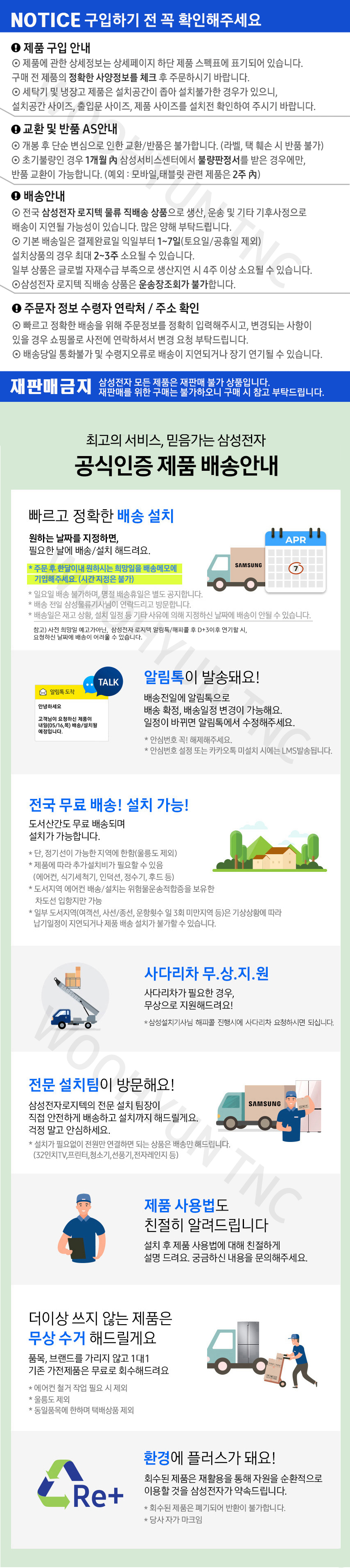 교환/환불가능 배송방법(택배사) : 삼성전자로지텍 (물류직배송) 삼성전자로지텍 물류배송 설명 : 삼성전자 물류는 택배회사가 아니므로, 운송장이 따로 나오지 않습니다. 이점 양해 부탁드립니다 매일 평일 오전 9시 발주된 건을 취합하여, 삼성전자로 주문접수를 진행합니다. 주문이 접수된 건은 삼성전자 물류 로지텍으로 전달되어, 대물류센터의 재고상황에 맞게 배송이 이루어집니다. 대물류센터의 재고가 바로 출하 가능하다면, 고객님의 주소지의 소물류로 재고가 이동하게 됩니다. 소물류로 이동한 뒤, 삼성전자 설치기사님이 배정됩니다. 이후 알림톡을 통해 다음날 설치배송이 이루어짐이 고지됩니다 (알림톡에서 날짜 변경 가능 +3일씩 총 3번) *대물류의 재고가 있지 않아도, 공장 생산조달을 통하여 대응합니다. 이로인한 배송지연이 발생할 수 있는 점 양해부탁드립니다 (대물류의 재고를 정확히 파악할 수 없으므로 지연이슈로 인한 판매중단 및 품절처리가 불가함을 사전안내드립니다)* |